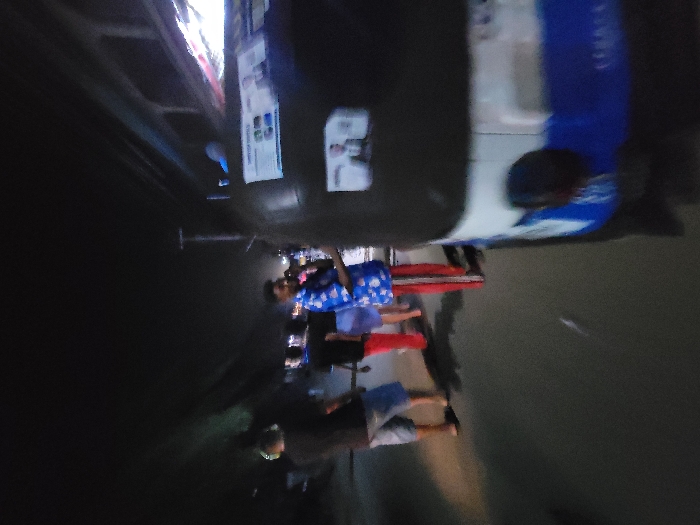 People are standing near a building. Some are wearing blue and red clothing, while others are in casual wear. The building has blue and white elements with what looks like text or graphics on its exterior. The environment appears to be outdoors with dim lighting and a dark background. The perspective is from a low angle looking upward.