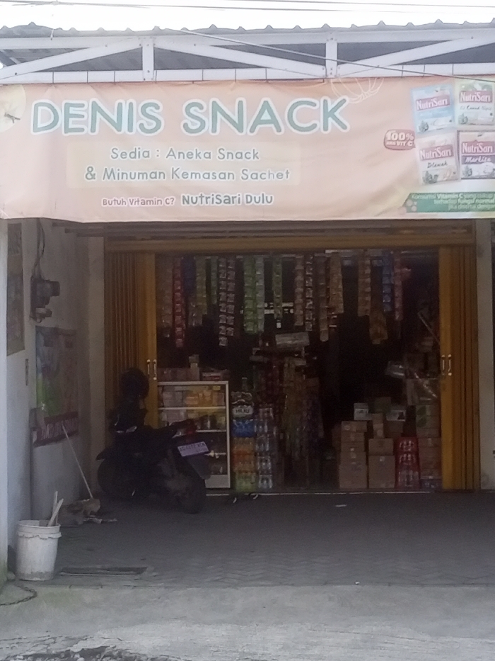 exterior of a small shop named "Denis Snack," located in Kecamatan Waru, Indonesia at coordinates -7
