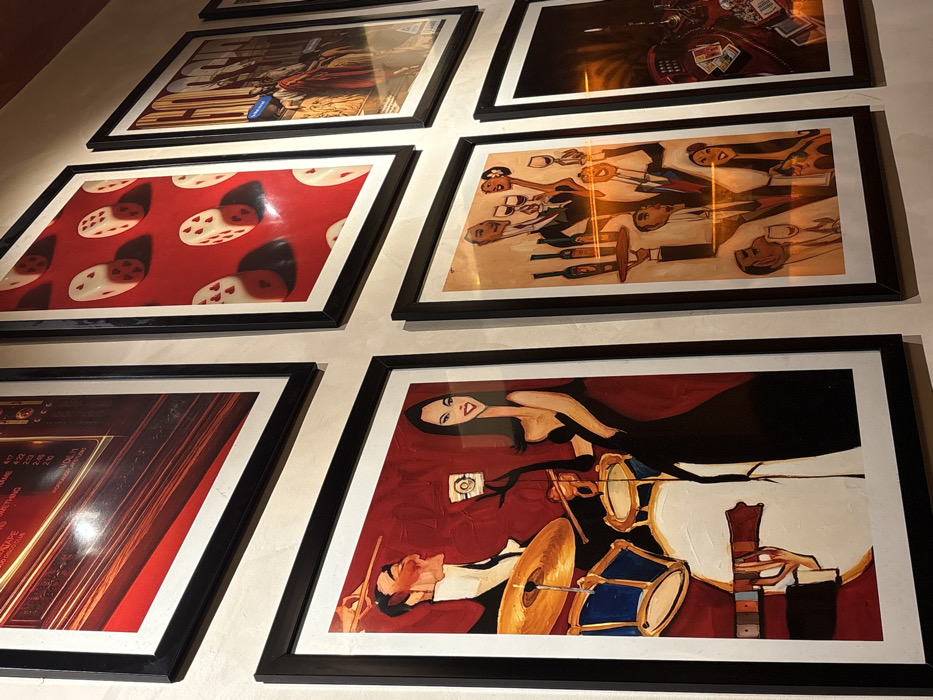 This image depicts a section of a light-toned wall in Howrah, India, displaying six framed artworks arranged in a grid pattern. All artworks are enclosed in black frames with white mats. Warm, artificial lighting creates reflections across the protective glass of several frames. The top row includes three vertical artworks. The partially visible top left artwork features a red background with abstract linear elements and text indicating music track details, such as 'DISCOTAPE' and 'VOL. II'. The top center artwork displays a red background covered with multiple white dice, each consistently showing six pips, casting distinct shadows. The partially visible top right artwork depicts a stylized scene with a central robed figure, likely a monarch, surrounded by other individuals, with the legible word 'RAGHOU'. The bottom row also contains three vertical artworks. The bottom left artwork presents a stylized jazz composition on a red background, featuring a male drummer with a blue drum kit and a female figure in a black dress and gloves holding a small white square item with a spiral design. A hand playing a guitar is visible at the bottom. The bottom center artwork, on an orange background, illustrates a social gathering with several stylized figures holding wine glasses; one figure carries a tray with three wine bottles. The partially visible bottom right artwork shows a darker scene featuring playing cards, poker chips, and a glass, indicating a card game environment.