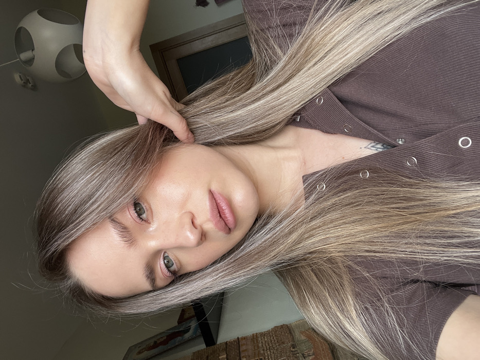 A female individual is depicted in a close-up indoor portrait, gazing directly at the camera. She has long, straight, blonde and light brown hair with visible roots, partially styled behind her left ear (viewer's right). Her left hand (viewer's right) is raised, with fingers touching the hair above her ear. She has light-colored eyes, possibly green or hazel, and her face shows light makeup, including pink eyeshadow and pink lipstick. She is wearing a brown, short-sleeved, ribbed top with multiple silver snap buttons running down the front. A portion of a dark tattoo, resembling a stylized leaf or feather, is visible on her upper chest/décolletage area beneath the partially unbuttoned top. The background shows an indoor residential setting. To the left (viewer's left), a portion of a multi-tiered wooden structure is visible, possibly a shelf or an elaborate frame, with a faint, partially obscured image resembling an icon on its surface. To the right (viewer's right), a light-colored door frame with a frosted or dark glass panel is present. Above the door frame, a white, spherical modern light fixture or lampshade with geometric cut-outs hangs from the ceiling. The walls appear to be a solid light color. The lighting suggests a natural light source from the left, highlighting the subject's face. The specific location within Saint Petersburg, Russia, cannot be determined from the visual information provided.