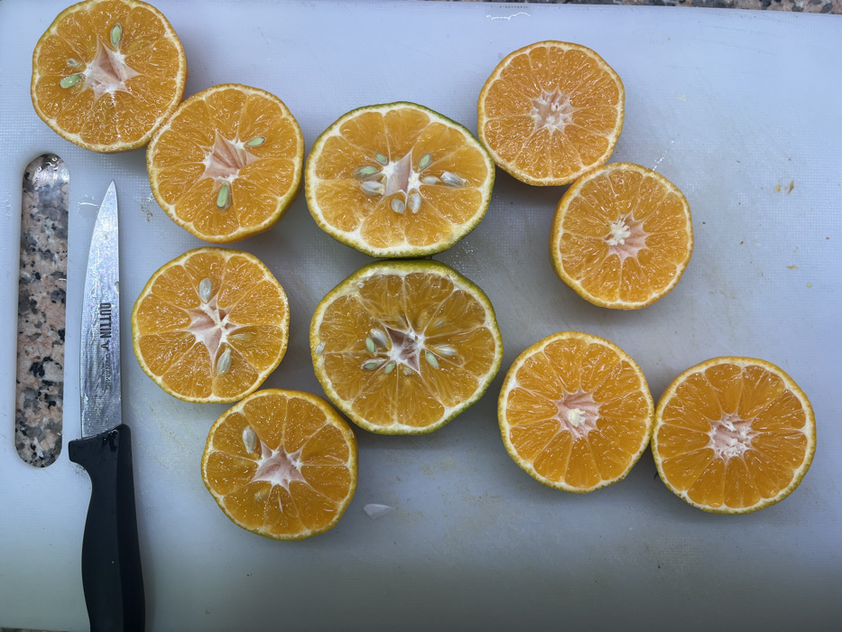 The scene, located in Torrent, Spain, depicts an overhead view of a white cutting board resting on a speckled granite countertop. A black-handled kitchen knife, with a silver blade marked "DUTTIN DYNAMIC," is positioned horizontally in the upper left quadrant of the cutting board. Thirteen halves of citrus fruit, consistent with tangerines or small oranges, are distributed across the board. Each fruit half displays its orange segmented flesh, white pith, and varying numbers of light-green seeds. Drops of liquid, consistent with fruit juice, are visible on the surface of the cutting board. No individuals are present.