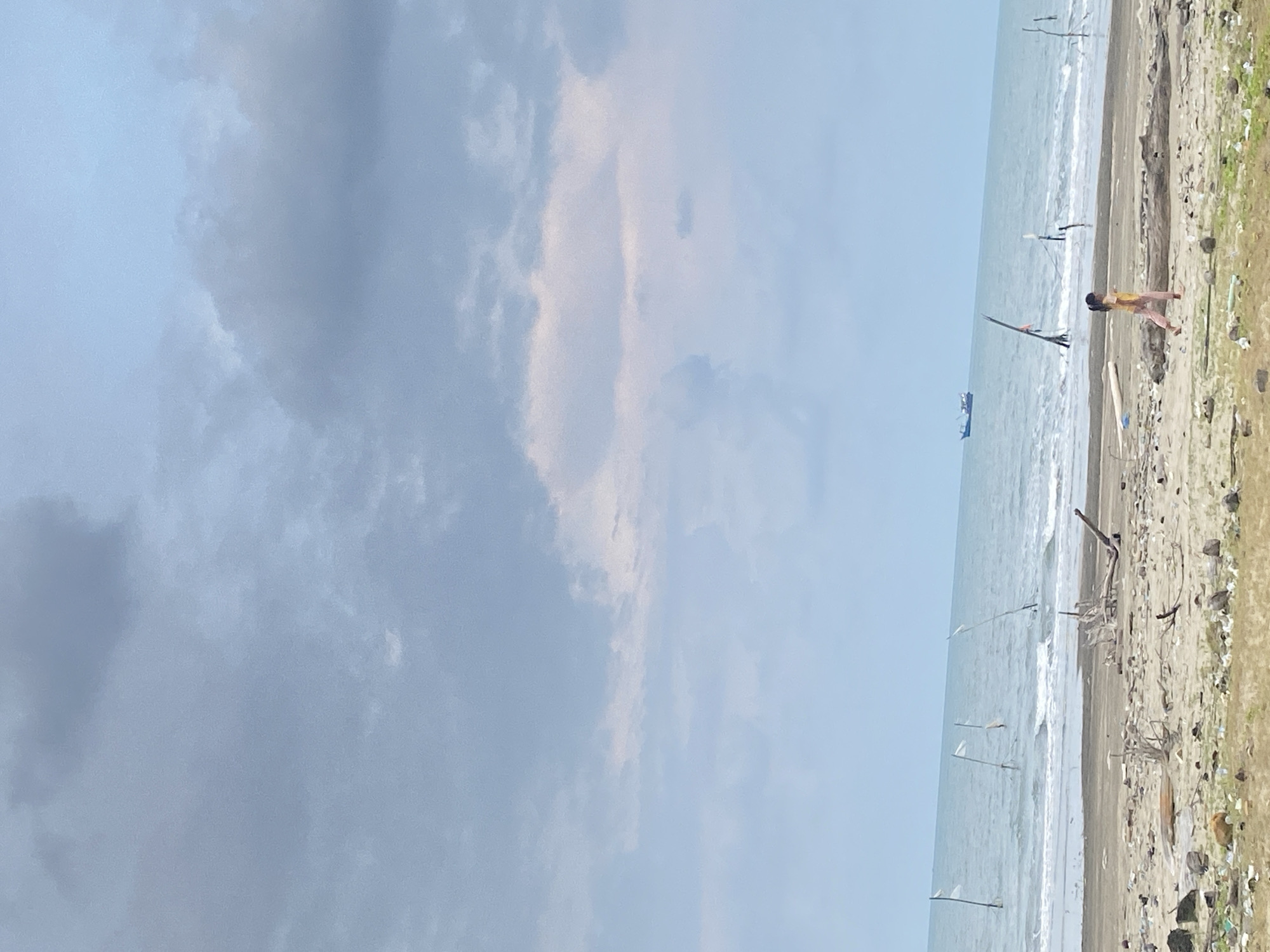The image captures a coastal scene in Idi Rayeuk, Indonesia, under an overcast sky. The sky transitions from a light blue at the horizon to denser, grey clouds higher up. The light blue ocean exhibits gentle waves breaking on the shore. A small, dark blue fishing boat is visible in the distant water, moving from right to left. Several slender wooden poles, each bearing a small white flag, are vertically embedded in the shallow water along the shoreline. The sandy beach in the foreground is covered with scattered natural debris, including driftwood and branches, interspersed with patches of green vegetation. A single young individual, wearing a yellow short-sleeved top and light pink trousers, is walking from right to left across the sand in the lower right quadrant of the frame.