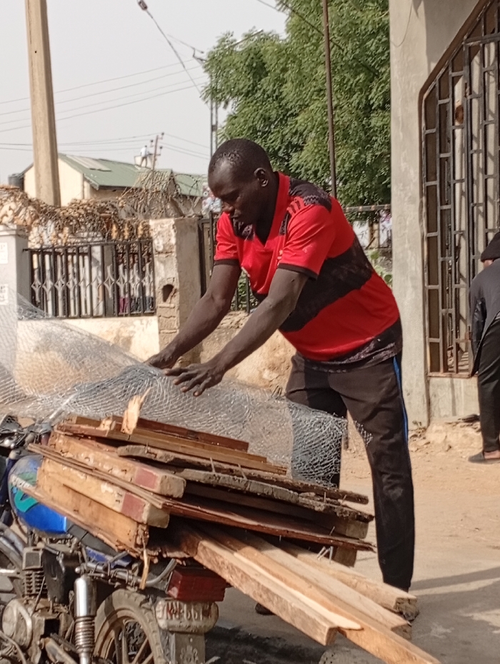 A daylight scene in Kwachiri, Nigeria, depicts an adult male positioned beside a heavily loaded motorcycle on an unpaved surface. The man, of African descent, wears a red short-sleeved t-shirt with black horizontal stripes and dark-colored athletic pants with a light blue stripe. He is leaning forward, with both hands resting on a large roll of silver-colored wire mesh that is part of the cargo. Beneath the wire mesh, a stack of various wooden planks is secured to the rear of a blue and silver motorcycle, partially visible on the left. In the background, multiple structures are visible under a clear sky. To the immediate right of the primary subject, a light-colored building with a dark metal security gate is present. Further back, a building with a green roof is seen, along with additional residential or commercial structures and a utility pole on the far left. Green trees with dense foliage are prominent in the mid-ground and background. A second individual, wearing dark pants and shoes, is partially visible standing on the far right edge of the frame.