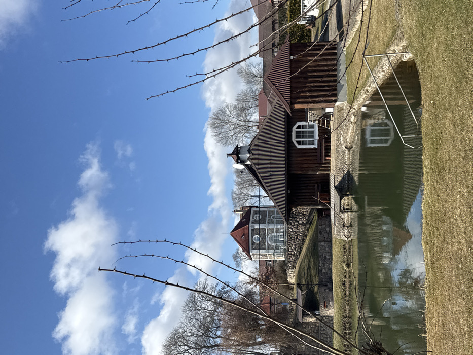 The image displays an outdoor scene under a bright blue sky with scattered white cumulus clouds, suggesting a sunny day during a leafless season. Bare, thorny branches partially frame the foreground from both the left and right. The midground features a dark green pond, reflecting the sky and nearby structures. Along the right edge of the pond, a stone retaining wall borders the water, where a metal handrail descends into the pond. Adjacent to the pond stands a dark brown wooden building constructed from vertical logs, featuring a dark corrugated metal conical roof, a prominent white chimney with a silver cap, and a satellite dish. A white-framed, multi-pane window is visible on its facade, with a wooden bench underneath and a small wooden platform extending over the water. To the immediate right of this structure, a smaller, similar wooden outbuilding with a corrugated roof is present. The ground in the midground and foreground is covered in dry, light brown grass. In the background, on a raised, stone-walled embankment, an octagonal stone house with a red-tiled conical roof and multiple arched and circular windows is visible. Numerous bare deciduous trees are scattered throughout the background, with additional buildings discernible in the distance. No individuals are present, and no actions or interactions are depicted. The scene is located in Падлабенскі сельскі Савет, Belarus.