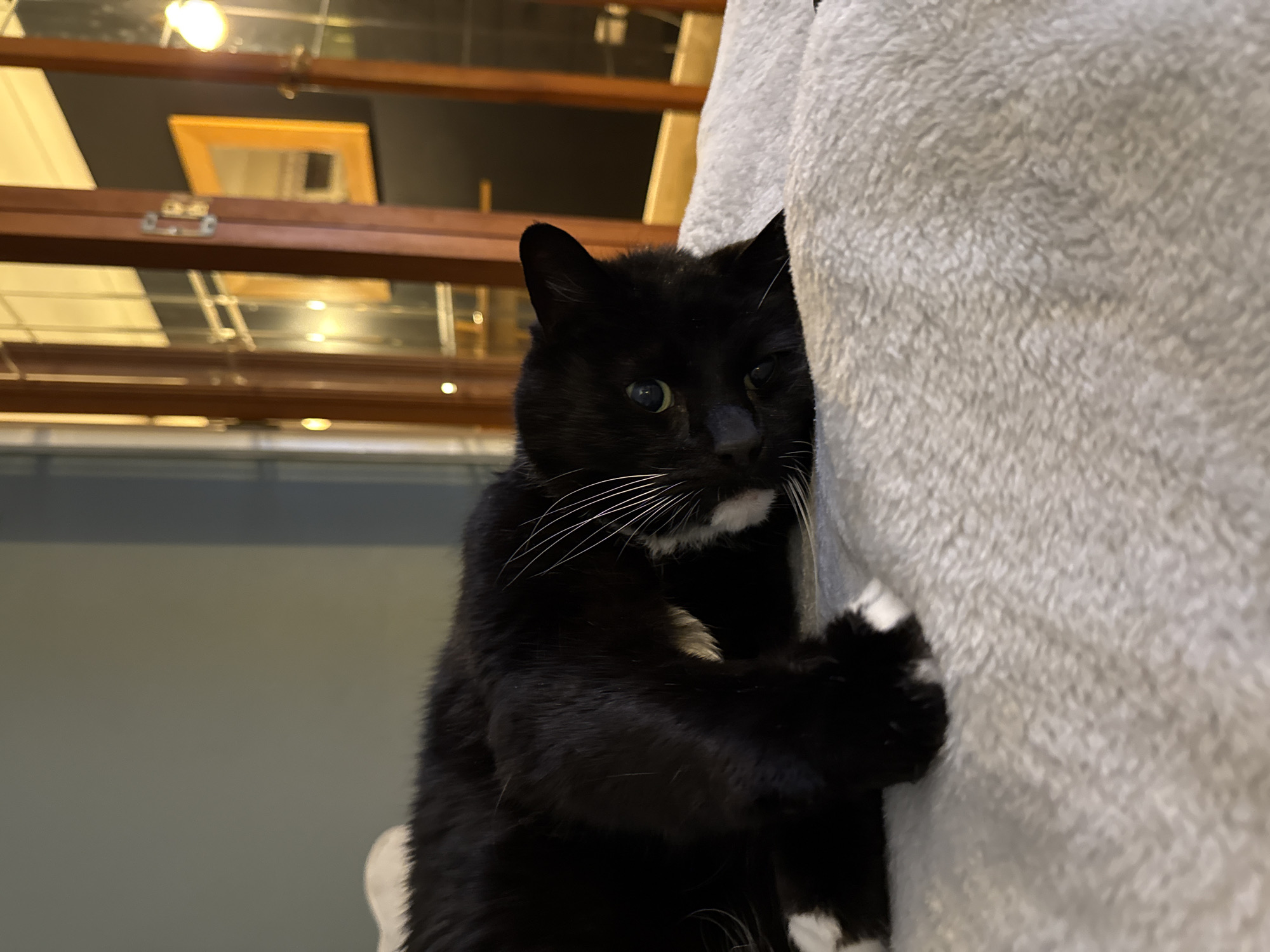 A black and white cat is clinging to a light gray, plush surface. The cat's face is turned toward the viewer, with white whiskers prominently displayed. Its paws are clenched, suggesting it is either scratching or gripping the surface. The background features a window with a wood frame. The location is indiscernible from this image.