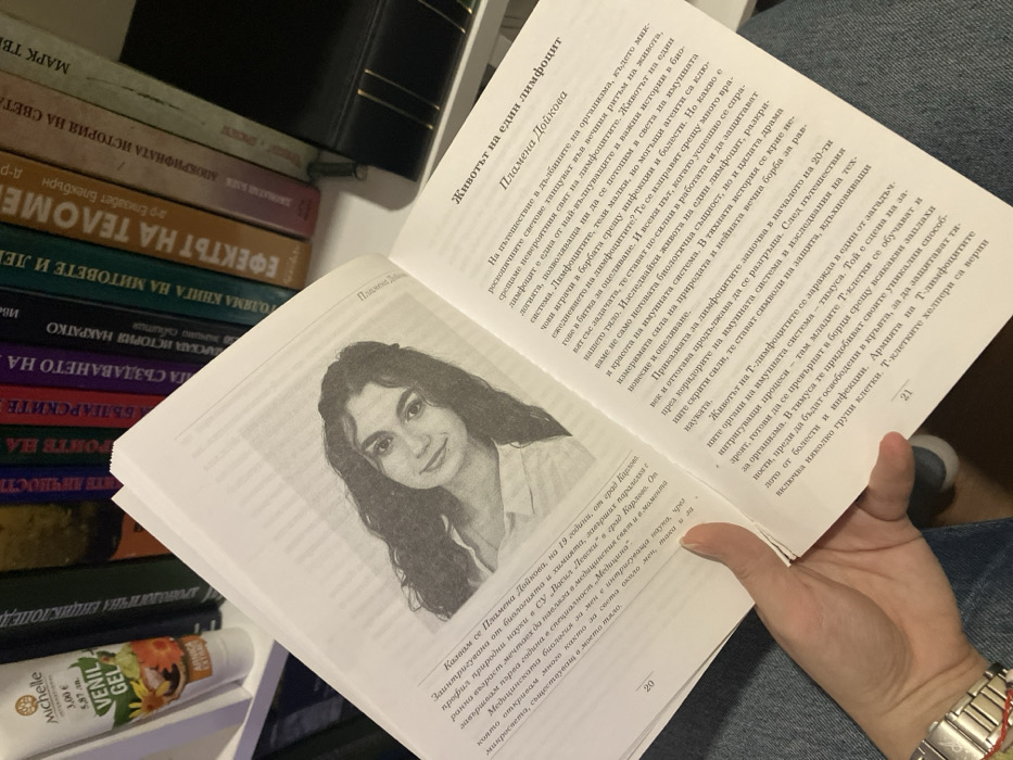 An overhead, slightly angled photograph depicts an open book held by a person's left hand. The hand, exhibiting manicured nails, wears a silver-toned wristwatch and a red string bracelet on the wrist. The upper portion of the person's thighs, clad in blue denim, are visible below the book. The book is open to pages 20 and 21, displaying Cyrillic text. Page 20 features a black-and-white headshot of a young woman with long, dark, wavy hair, smiling and looking forward. Adjacent Cyrillic text identifies her as Plamena Doykova, 19 years old, from the city of Karlovo, Bulgaria, stating she studies biology and chemistry and plans to pursue medicine at "Vasil Levski" University in Karlovo. Page 21 displays the Cyrillic title "Животът на един лимфоцит" (The Life of a Lymphocyte). The background reveals a white bookshelf stocked with numerous books displaying Cyrillic titles on their spines, including "ЕФЕКТЪТ НА ТЕЛОМЕРИ..." and "ИСТОРИЯ НА СВЕТА". A white tube of "Michelle INTERNATIONAL VENIL GEL" with "ARNICA EXTRACT" and a price label of "3.00 лв / 5,87 €" stands on the shelf's left side. The scene is located indoors in the city of Karlovo, Bulgaria, as indicated by the biographical text within the book.