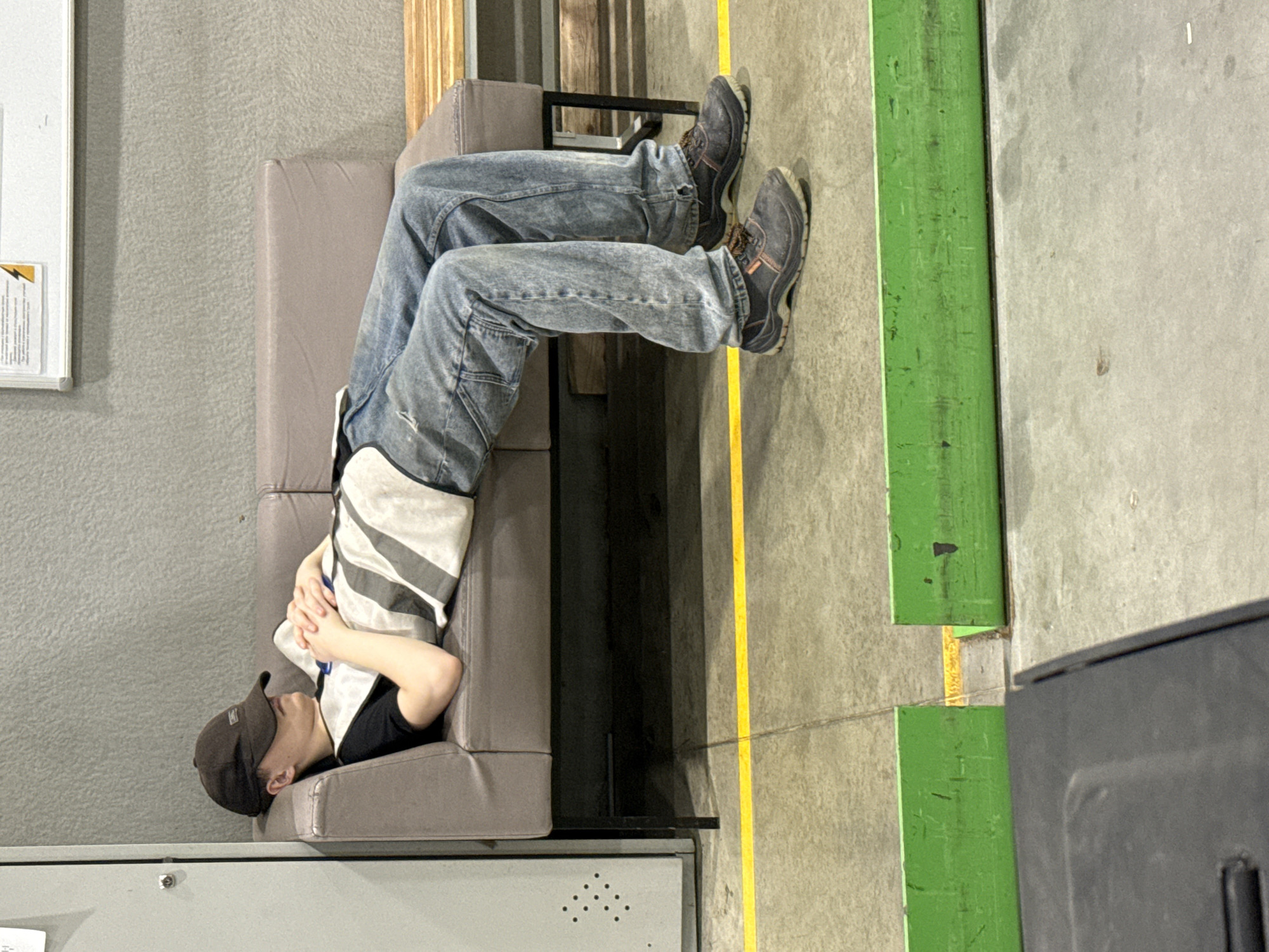 A person is lying on a gray couch. The person is wearing blue jeans, a black t-shirt, a white and gray striped shirt, and a baseball cap. The person is positioned with their head near the left edge of the image and their feet extended to the right. The couch is situated near a gray wall and a white cabinet or structure. A yellow line is visible on the floor, separating the area near the couch from a gray concrete surface with green elements. The location cannot be verified as Lupanovo, Russia.