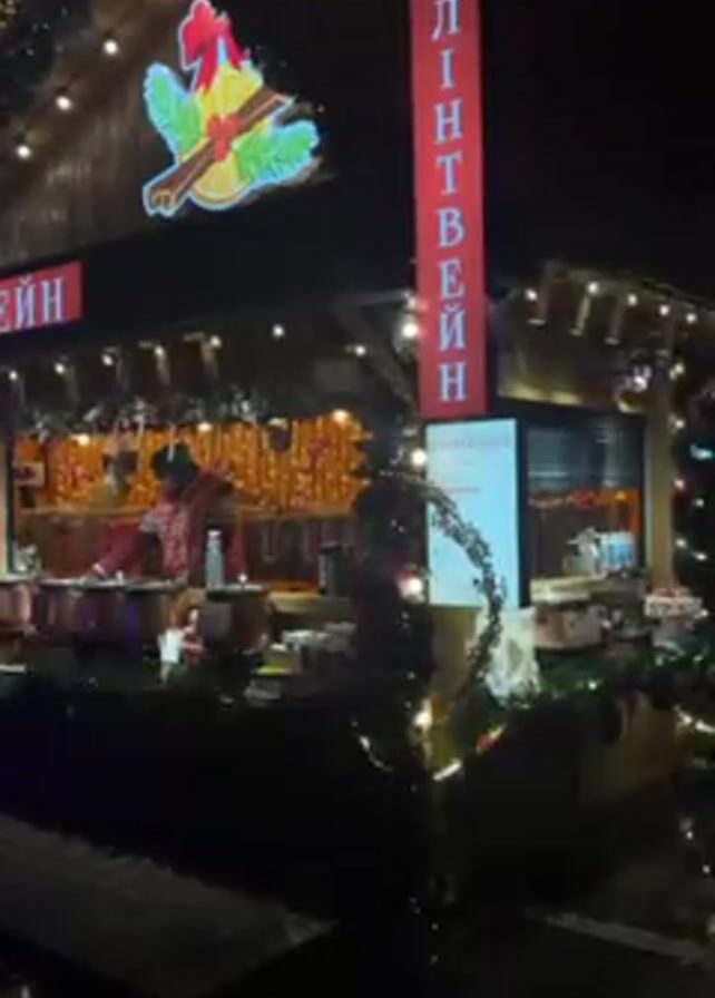 At night, an outdoor vendor stand at a Christmas market glows with warm lights. The stand’s roofline is decorated with strings of lights and festive greenery. A sign in red with white Cyrillic letters, “ГЛІНТВЕЙН”, or “Mulled Wine”, hangs vertically along one side of the stand. The sign is partially obscured by a garland with white lights. Another sign, to the left, has a festive bell, holly, and cinnamon sticks illustration. Inside, a person wearing a hat and red plaid shirt works behind the counter, preparing drinks. Various items are displayed on the counter, with rows of orange liquids in containers behind them. The stand is adorned with Christmas decorations.
