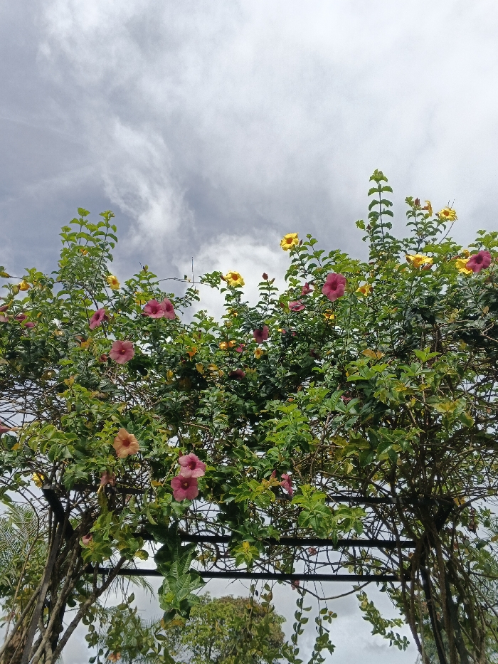 A wrought iron structure supports a vibrant display of flowering plants. The plants are densely covered in green foliage and a mix of pink and yellow flowers. The sky above is cloudy and overcast. Below the structure, glimpses of other trees and foliage are visible. The image is taken from a low angle, emphasizing the height of the flowering structure.