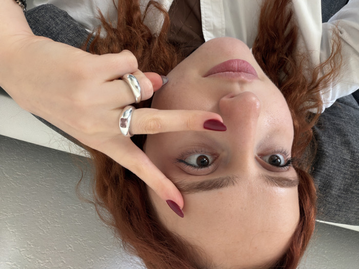 The image depicts a close-up, high-angle portrait of a young adult female in an indoor setting. Her face occupies the central and left portion of the frame, angled slightly to her right (viewer's left). She has fair skin, light brown to auburn wavy hair, and brown eyes. Her lips are a natural pink hue, and her fingernails are painted a dark burgundy color. Her left hand is raised, with the index finger touching the skin below her right eye and the thumb positioned near her right eyebrow, forming a "V" shape. Two silver-toned rings are visible on her left hand: a plain thick band on her ring finger and another thick band with a rectangular reddish-brown stone on her middle finger. She is wearing a white collared shirt, and a dark brown garment is visible beneath it. The background consists of a textured grey fabric object, possibly a couch or cushion, on the left, and a plain light-colored wall or surface on the right. The indoor setting lacks discernible features to identify its location as Reims, France.