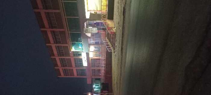 two-story building with a large glass storefront located at -0.539 latitude and 37.455 longitude, in Embu, Kenya. It appears to be nighttime. The building has a red brick facade and is lit from inside. The entrance to the building is via a set of stairs, which are made of concrete and have a metal handrail. There is a metal fence in front of the building. The street in front of the building is empty. There are no people visible in the image. The image appears to have been captured from a street-level perspective. The image is poorly lit and has a grainy texture. The image appears to be out of focus.