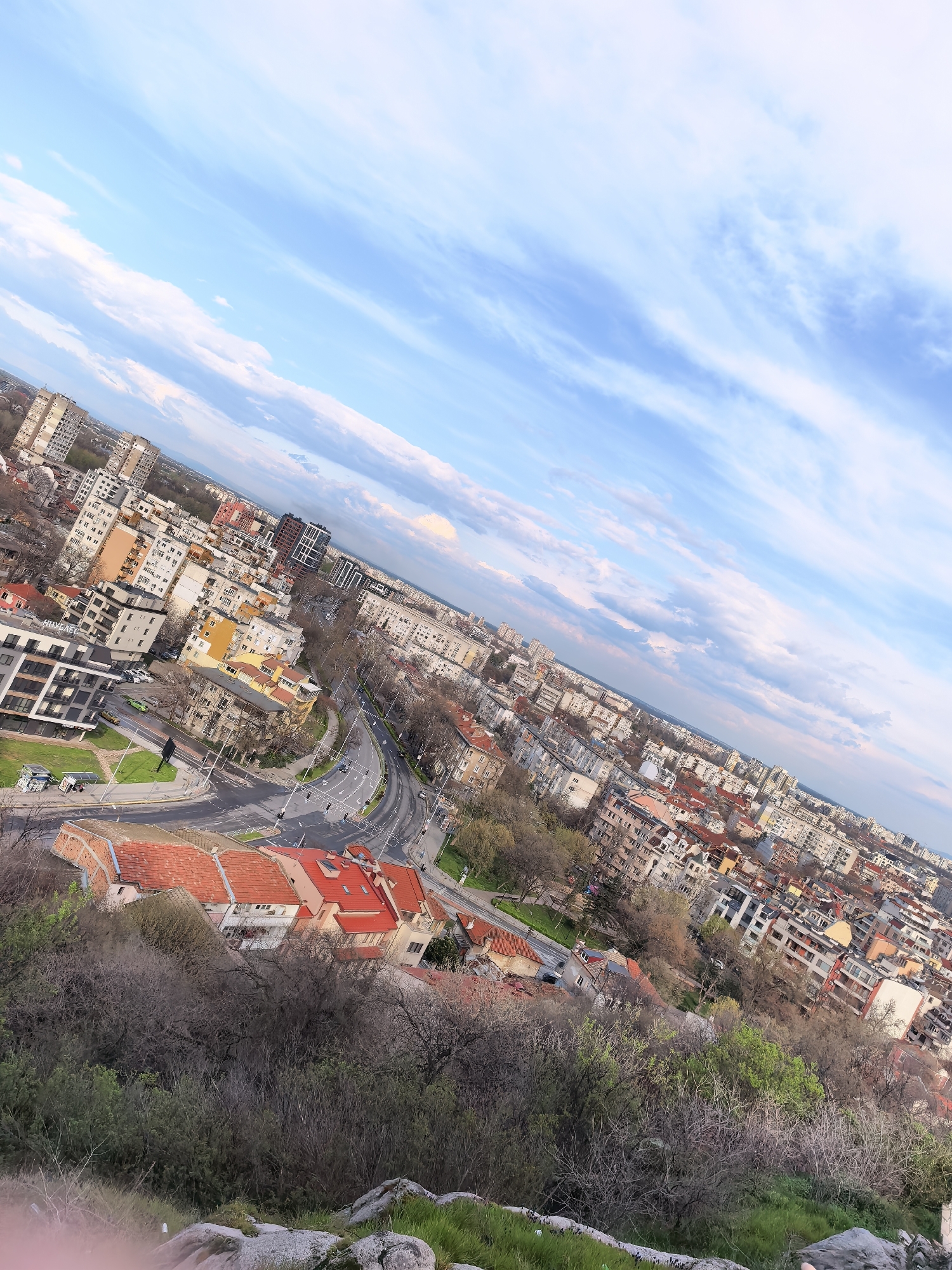 n elevated, oblique view of the city of Plovdiv, Bulgaria, during daylight. The foreground includes a rocky outcrop with sparse vegetation transitioning into a dense area of trees and shrubbery with varying degrees of foliage. The urban landscape in the midground is a mix of residential and commercial buildings with varying architectural styles, primarily characterized by red-tiled roofs and light-colored facades. The road network features a curved avenue with visible traffic. The background shows more distant buildings, which are generally high-rise apartments. The sky is light blue with streaks of white clouds, typical of fair weather conditions.
