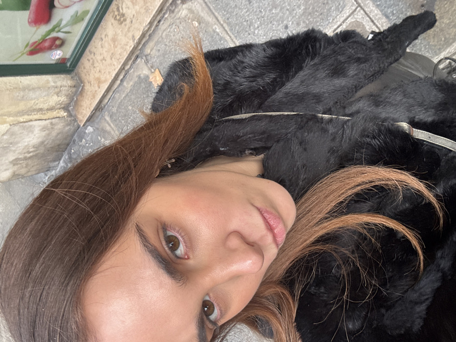 A young adult female is depicted in a high-angle, close-up portrait, looking directly at the camera. She has long, straight, dark brown hair with reddish highlights, brown eyes, and light pink lips. She is wearing a black faux fur coat; a silver-colored cross earring is visible in her right ear, and a light-colored strap crosses her chest. The scene is an urban outdoor environment, identifiable as the city of Paris, France, by specific architectural and ground features. The background includes a building facade constructed of aged, light-colored stone blocks and a grey flagstone sidewalk. To the upper right, a green-framed shop window displaying stylized images of produce is partially visible. A few dry, brown leaves are scattered on the sidewalk.