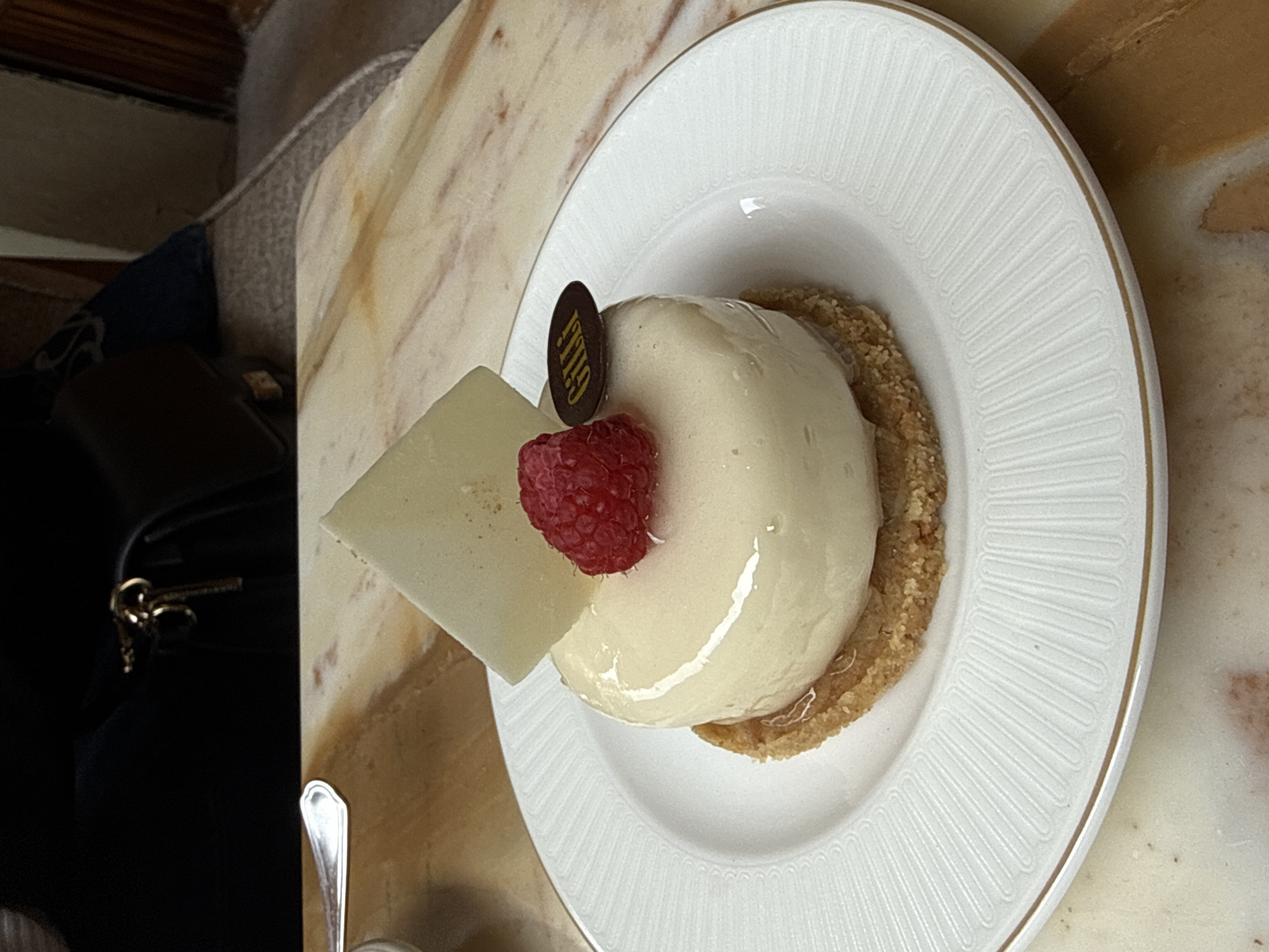 A white, glossy, cylindrical dessert rests on a crumbly biscuit base, centered on a white, gold-rimmed plate with a radial embossed pattern. The dessert is topped with a single red raspberry, a white triangular decorative piece, and a small, dark brown oval disc inscribed with the gold text "GILLI." This plate is positioned on a polished, light-colored marble table exhibiting reddish-brown veining. In the upper left background, a dark object, likely a handbag or jacket, shows a gold zipper pull or clasp. A silver spoon is partially visible on the table to the left of the dessert. The upper right background displays blurred elements, including a patterned upholstered surface and indistinct vertical architectural features. Based on the "GILLI" branding, the scene is set at Caffè Gilli in Piazza della Repubblica, Florence, Italy.