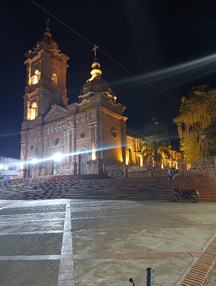 A brick church stands illuminated against a dark sky. The church features two towers, one with a clock face, and a central dome, each topped with a cross. A wide set of stairs leads up to the church entrance. A parked motorcycle and two people are on the steps. The foreground is a stone-paved area, partially wet or shiny, reflecting light. Tree branches are visible to the right, with moss-like vegetation hanging down.