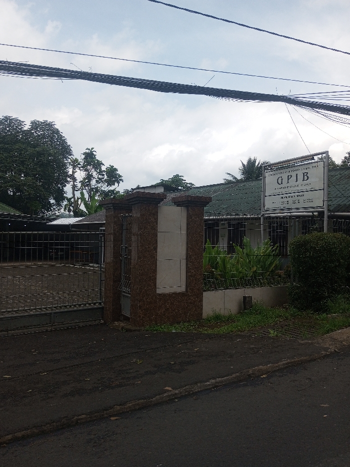 The image displays an outdoor, street-level perspective of a gated property and a building, ostensibly located in Chori, Nigeria, under an overcast sky. In the foreground, a dark, uneven paved surface, likely a roadway or driveway entrance, occupies the bottom of the frame. A large, dark grey metal gate with a grid design is visible on the left, flanked by two substantial pillars adorned with reddish-brown patterned tiles and integrated lighter beige panels. A smaller pedestrian gate is positioned to the right of the main gate within the pillar structure. Beyond the gate, a paved area leads towards a building with a dark green tiled roof. The building's lower facade is partially obscured by a low metal fence and dense green foliage. Windows, protected by dark metal bars, are visible behind the plants. To the right of the entrance pillars, a prominent rectangular white sign with a dark frame is mounted. Legible black text on the sign reads: "GEREJA PROTESTAN DI INDONESIA BAGIAN BARAT", "GPIB", "JEMAAT BUMI SERPONG DAMAI", and "SEKTOR II". Dense green trees and bushes are visible behind the property on the left and also contribute to the greenery surrounding the building on the right, with a manicured hedge present on the far right. Multiple dark electrical or communication cables span horizontally across the upper portion of the frame against the cloudy sky. No individuals, animals, or vehicles are present in the scene.