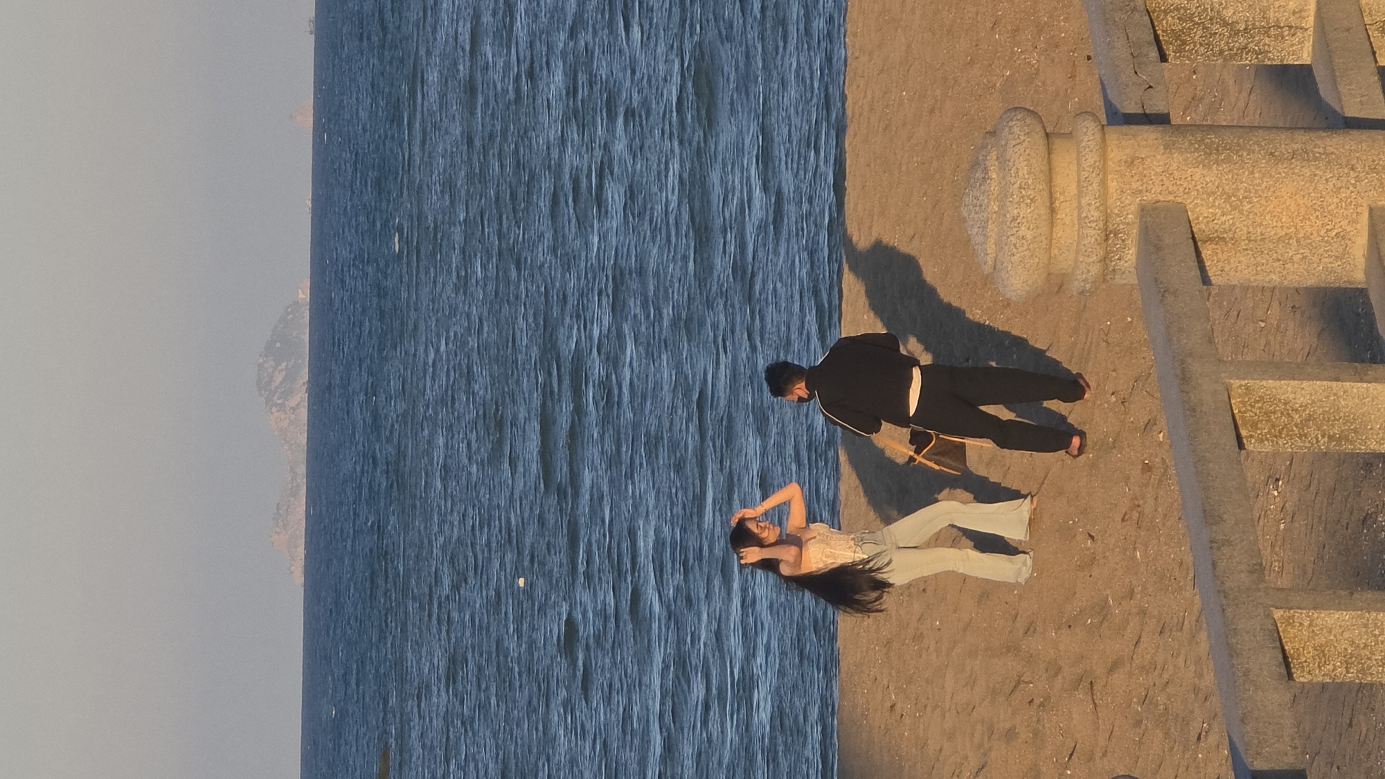 The image depicts a coastal scene in Nha Trang, Vietnam, during golden hour, characterized by warm, low-angle sunlight casting long shadows. In the foreground, a gray stone balustrade with a decorative finial on a post partially obscures the bottom right of the frame. Beyond this, a light-colored sandy beach extends to the water's edge. Two individuals are present on the beach. On the left, a female with long, dark hair wears a light-colored strapless or spaghetti-strap top and light-wash flared jeans. Her hands are raised to her head, and she appears to be adjusting her hair or posing. Her gaze is directed towards the male subject. On the right, a male wears a black jacket with white arm stripes, dark pants, and red-brown sandals. He has a dark face mask pulled down, partially covering his chin. He carries a brown handbag with a distinctive pattern (possibly Louis Vuitton monogram) and a light strap on his left side. His body is slightly angled towards the female. Both individuals cast elongated shadows on the sand, extending towards the lower left. The calm, blue-green ocean dominates the midground, exhibiting visible ripples on its surface. A small, light-colored object floats on the water in the upper midground. On the distant horizon, a prominent, multi-peaked island or landmass is visible, along with at least two smaller landforms further right. Several small vessels or boats are discernible on the water near these distant landmasses. The sky above is a pale blue-grey, transitioning to a lighter hue near the horizon, indicative of haze or distant conditions.