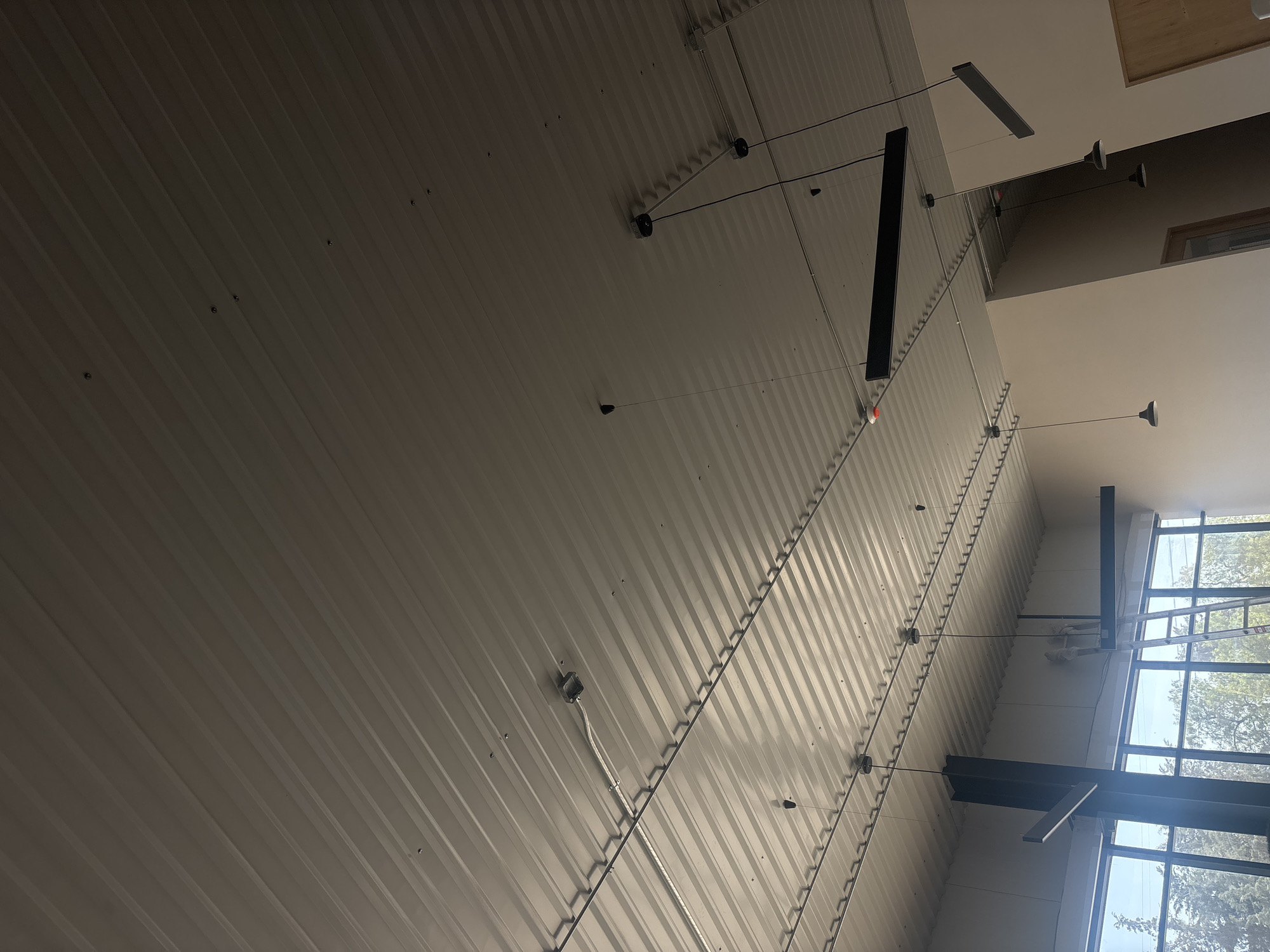 The image depicts an interior view of a commercial or industrial space located in Buenavista, Mexico. The ceiling consists of light gray, corrugated metal panels with exposed electrical conduits and junction boxes running across them. Multiple black-colored pendant light fixtures are suspended from the ceiling at various heights. These include several elongated, rectangular linear fixtures, some hanging horizontally and one at an angle, as well as smaller bell-shaped fixtures. A red circular device, possibly a smoke detector or fire alarm, is mounted on the ceiling. Along the left side, large rectangular windows provide a view to the exterior, revealing green trees and a clear sky. A black vertical structural beam or column stands prominently near the windows. Interior walls are painted a uniform light beige or cream color. A silver A-frame ladder with multiple rungs is positioned near the windows, its top resting against the wall. A wooden door is partially visible on the right side of the frame, blending with the beige wall. No individuals are present in the scene, and no specific actions or interactions are depicted. The overall environment suggests a modern, functional space, potentially undergoing finishing touches or awaiting occupancy.