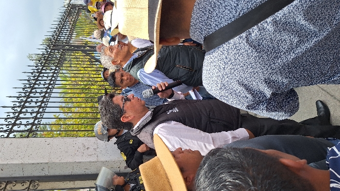 The image depicts an outdoor gathering occurring on a paved surface in Miraflores, Peru. A prominent, ornate black metal fence with decorative spires spans the background, bordered on the left by a substantial light-colored stone pillar. Behind the fence, green foliage from trees or bushes is visible under a partly cloudy sky. In the center foreground, a male individual, appearing to be middle-aged, is speaking into a black microphone held in his right hand. He wears sunglasses, a white long-sleeved shirt, a dark padded vest (with an indistinct logo), dark trousers, and black shoes. To his immediate right, an older male with grey hair stands, wearing a light blue collared shirt, a dark padded vest, and a tie, looking towards the right. The scene includes a diverse group of people. On the far left, a person wearing a light brown fedora-style hat is partially visible. In the immediate foreground, the back of a person's head and shoulder are seen, dressed in a dark blue and white speckled patterned shirt with a black strap. Numerous other individuals form a crowd behind and to the right of the central figures, some wearing various hats, including straw hats. Several police personnel are identifiable behind the central speaker and near the stone pillar. They wear dark uniforms and helmets, with at least one officer having a clear face shield lowered. The word "POLICIA" is faintly visible on one helmet. The individuals are mostly standing, observing, or listening to the central speaker.