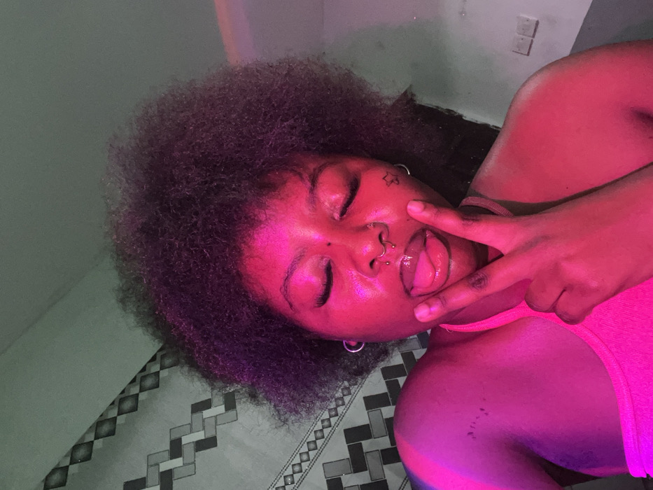 A woman with dark skin and curly hair poses, bathed in red light. Her eyes are closed, and her tongue is sticking out as she makes a peace sign. She has facial piercings in her nose and star tattoos on her face. The background is a light green wall with a white electrical outlet and a patterned tile floor. The lighting is predominantly pink and red. The woman is wearing a pink tank top.
