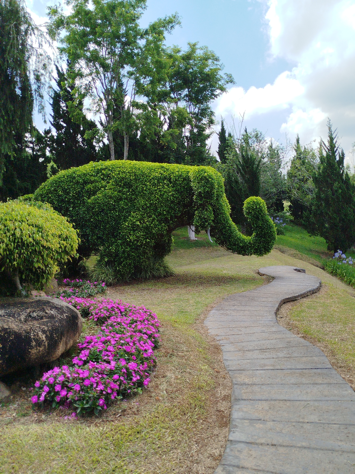 This image captures a picturesque scene in Lâm Viên, Đà Lạt, Vietnam. A sculpted elephant bush sits prominently amidst a meticulously manicured garden setting. A grey, stone-laid pathway curves into the distance, inviting exploration of the scene. To the left, a dark boulder rests beside a vibrant bed of pink flowers, adding a splash of color to the lush greenery. Various shrubs and trees form a natural backdrop, providing depth and dimension to the landscape. The sky is partially covered with clouds, suggesting fair weather. There are no people present in the frame.