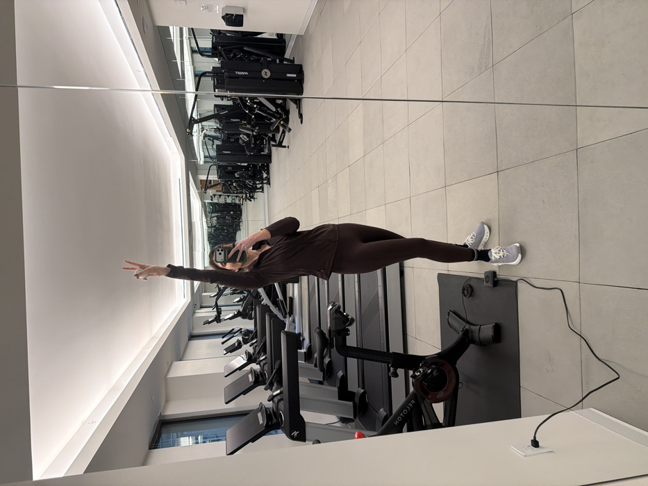 A modern gym interior in New York City, United States of America, is depicted. The scene is dominated by a full-length mirror reflecting a female subject taking a selfie. The subject, standing in the center-left of the frame, wears a dark brown long-sleeved athletic top and matching dark brown leggings. Her right arm is extended upwards, with her hand positioned to form a peace sign (V-sign), while her left hand holds a dark-colored smartphone, obscuring most of her face. She wears light grey athletic shoes with white laces and white socks. The gym features light-colored square tiled flooring and white walls. A row of dark-colored treadmills is visible behind the subject to her left, with a Peloton stationary bike in the foreground. Further into the gym, a variety of black strength training machines are reflected in the mirrored walls, extending into the background. The ceiling features recessed linear lighting elements. A white electrical outlet with a black cord plugged in is visible on the wall to the left, near the Peloton bike. A wall-mounted dispenser, possibly for hand sanitizer, is visible on a white wall section on the far right of the reflection.