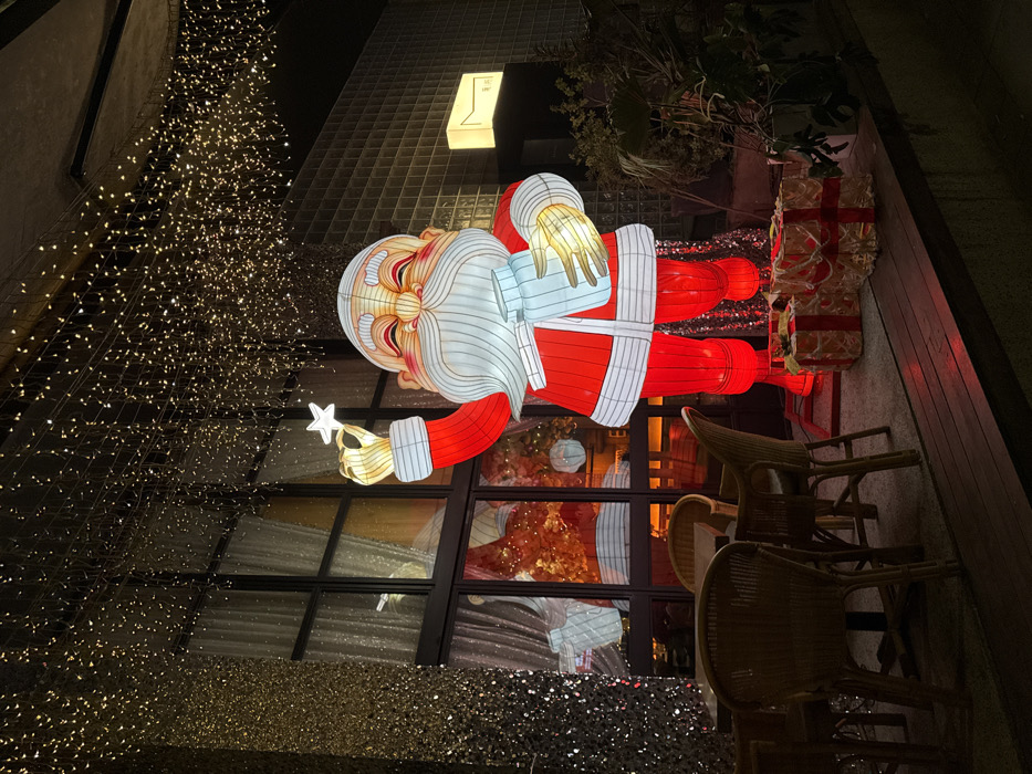 An illuminated Santa Claus lantern, approximately 2.5 meters tall, stands on a dark wooden outdoor platform in front of a building in 天宫殿街道, China, at night. The Santa figure is depicted in a red suit with white trim and beard, holding a glowing white star in its raised right hand and a glowing white jar or gift in its left. Two illuminated gift boxes with red bows are positioned at the base of the Santa figure on the wooden platform. To the left of the Santa, on the same platform, are three empty wicker chairs surrounding a small, dark-colored table. Behind the platform and furniture, a building facade consists of large glass windows framed in dark metal, reflecting interior warm, ambient lighting and possibly orange/red decorative elements. To the left of the windows, the building features a textured, sparkling wall surface. To the right of the Santa, the building facade transitions to a dark, gridded surface, possibly glass blocks or tiles, with a small rectangular, illuminated sign displaying Chinese characters. Overhead, hundreds of warm white string lights are suspended, forming a canopy that illuminates the entire outdoor area. No individuals are present in the scene.