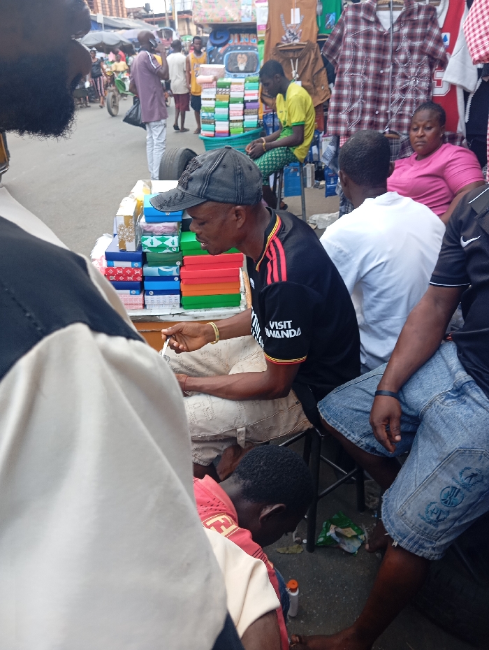 A street scene shows a vendor with a black cap, dark shirt, and beige pants sitting beside stacks of colorful small boxes. He holds a small tool in his hand. In front of him, a younger person in a red shirt is bent over, possibly working on someone's feet. Other people are standing and sitting nearby, and clothing is displayed in the background. The scene takes place on a busy street with other vendors and pedestrians.