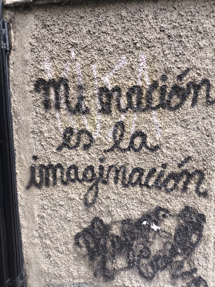 Black graffiti on a rough, tan wall reads "Mi nación es la imaginación