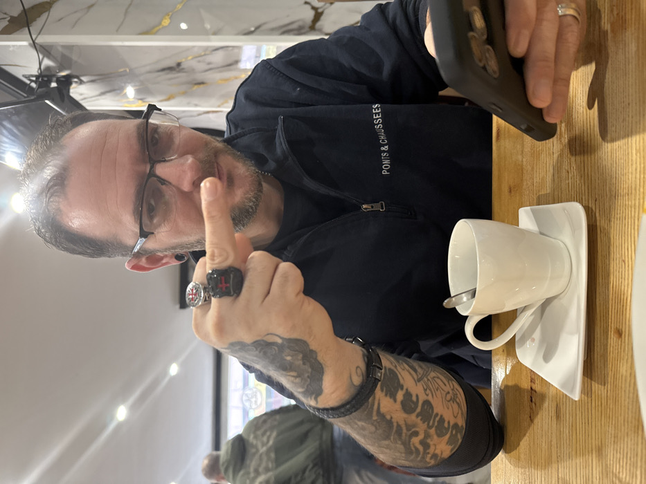 The image depicts an indoor scene within a commercial establishment in Grevenmacher, Luxembourg. A Caucasian male, estimated to be in his 30s-40s, is centrally positioned, looking directly at the camera. He has short dark hair, a stubble beard, black-framed eyeglasses, and black ear gauges. His left arm is heavily tattooed, adorned with a black braided leather bracelet on the wrist. On his left index finger, he wears a silver-colored ring with a red circular emblem, and on his left middle finger, a dark rectangular ring with a red cross design. His left index finger is extended, pointing towards the viewer. He wears a dark blue quarter-zip pullover with "PONTS & CHAUSSEES" visible in white text on the right chest. His right hand holds a black smartphone with a multi-lens camera, and a silver-colored ring is on his right ring finger. On the light-colored wooden table in front of him rests a white ceramic mug containing a spoon, placed on a square white saucer. In the blurred background, another male individual wearing a green hooded jacket is partially visible, facing away. The environment features bright overhead lighting and walls with white and marble-like paneling.