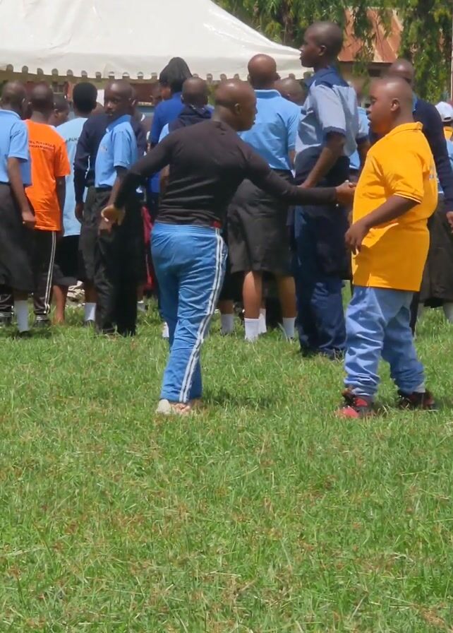 group of people, mostly young men, standing on a green lawn. There's a white tent in the background. Most of the young men are wearing blue school uniforms with black skirts or trousers. Some wear other colors like orange or yellow. One adult man is wearing a black long-sleeved shirt and blue pants with white stripes. He dances with a boy in a yellow shirt and blue jeans. The lawn appears well-maintained. There are trees in the background, and some buildings can be seen in the distance.