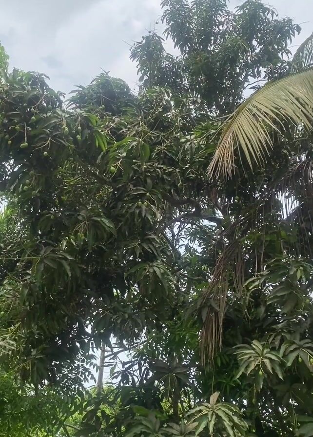 collection of trees, including a mango tree laden with green mangoes and a coconut palm tree with its characteristic fronds. The sky is overcast, suggesting a cloudy day. The overall impression is that of a tropical landscape with varied vegetation.