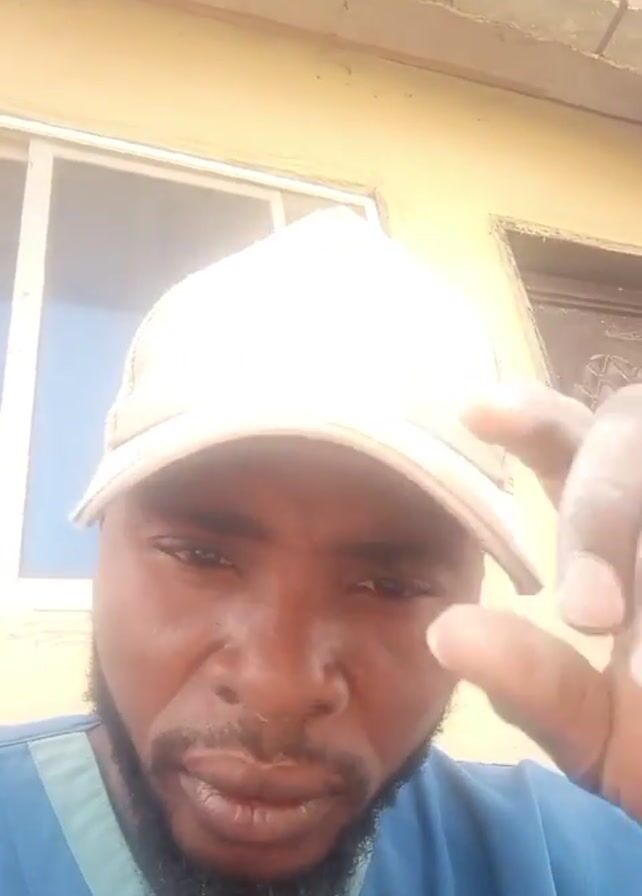 A man with a beard and wearing a blue shirt and white cap looks at the camera. In the background, a woman wearing a patterned dress is using a grinding machine on a porch in front of a house.