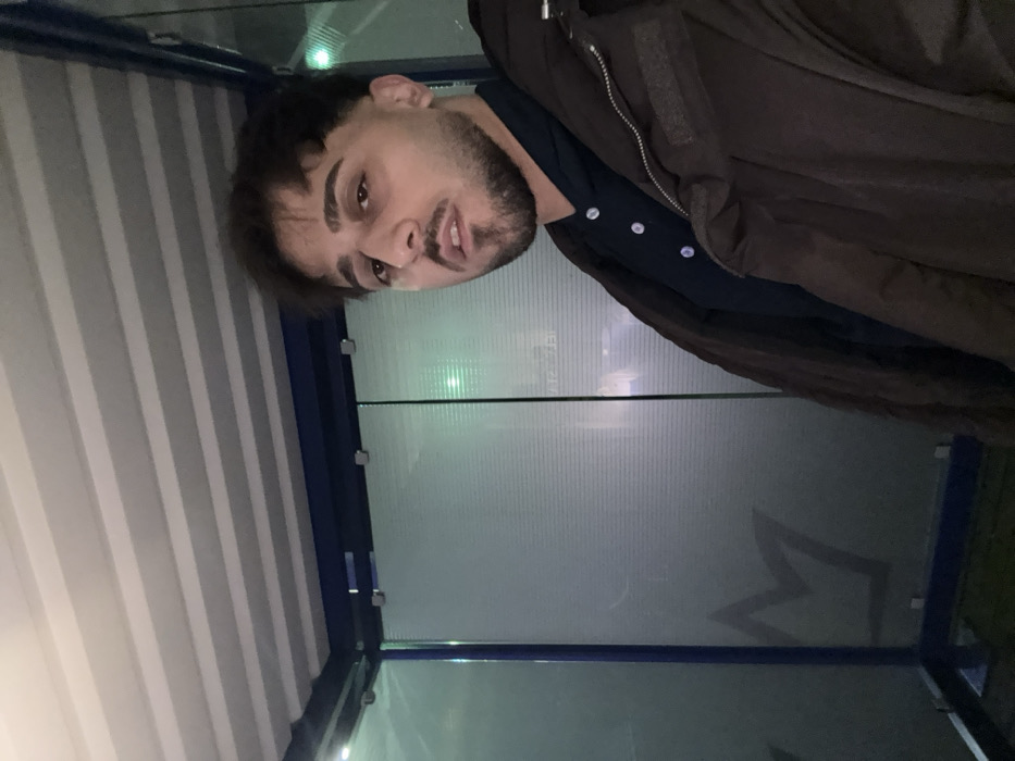 An adult male with short, dark hair, a beard, and a mustache is depicted from the chest up, looking directly at the camera. He wears a dark blue polo shirt with light buttons and a dark brown, puffy winter jacket. He is positioned within a sheltered structure featuring a white, horizontally corrugated ceiling and dark blue metal support beams. The background consists of frosted glass panels, some exhibiting horizontal striations. A faint, stylized crown logo is visible on a lower-left glass panel. Text resembling "JETZT STARTEN" is subtly visible on a central glass panel. The environment is dimly lit with artificial green light reflections. Based on the discernible "crown" logo and "JETZT STARTEN" text, the location is identified as a sheltered entrance or waiting area associated with a McFit gym, specifically in the vicinity of the McFit gym located at Alleestraße 1-3, 42853 Remscheid, Germany.