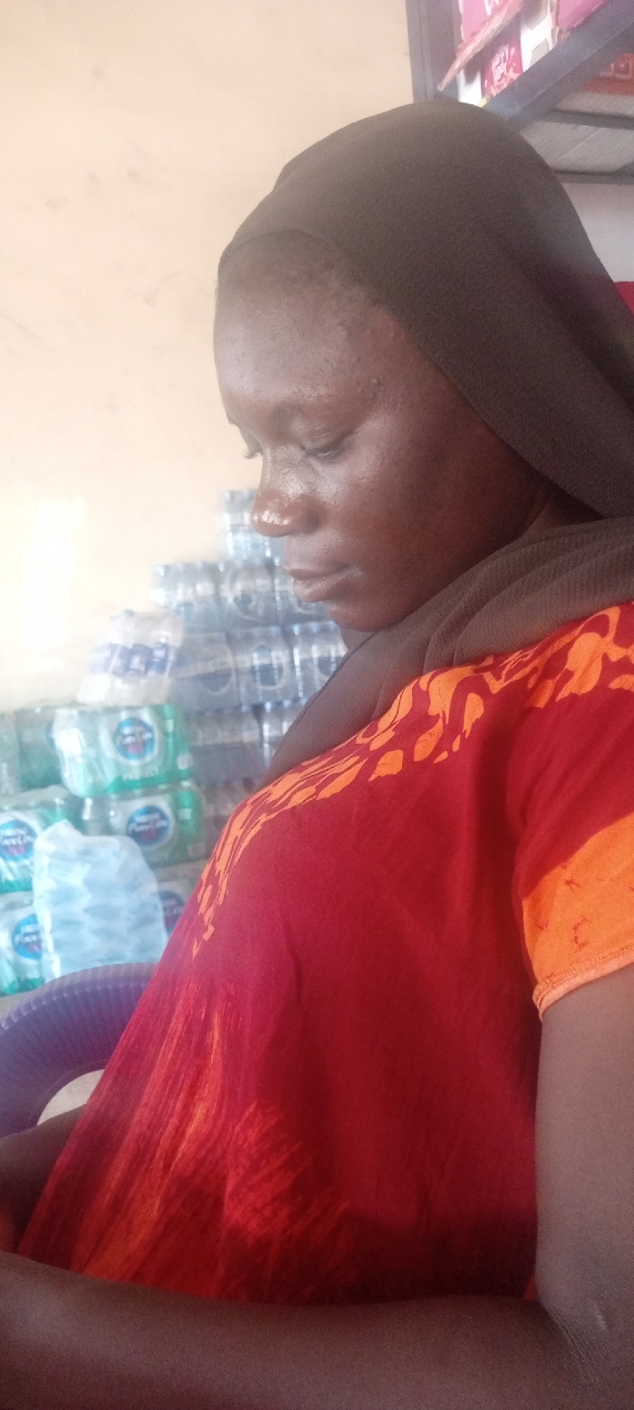 The image displays a female individual, with dark skin, seated indoors at Aviation Quarters, Nigeria