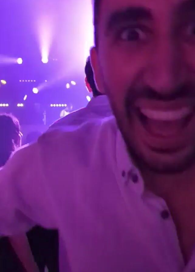 A man with a beard smiles at the camera in a crowded, dimly lit room illuminated with colorful spotlights. He is wearing a light-colored collared shirt. The camera then pans to show a band performing on a stage behind a crowd of people dancing. The room is lit with red and yellow lights.