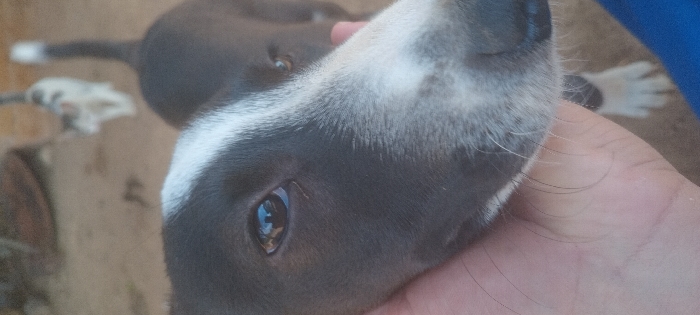 A close-up image of a dog's head. The dog has black and white fur, with the white fur appearing on its muzzle, eyebrow, and paws. A hand is holding the dog's face gently. The dog's eye is visible and appears to be brown. The background is blurred, but it seems to be an outdoor setting with dirt and some indistinct objects.