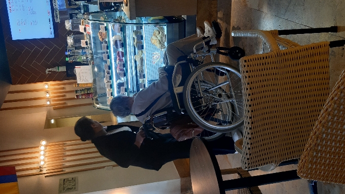 The image captures an interior scene within a cafe or bakery located in Bogota, Colombia. Two individuals are present. A person in dark attire, consisting of a jacket over a white top and dark trousers, stands on the left, actively pushing a manual wheelchair. Seated in the wheelchair, with their back to the viewer, is an older adult with grey hair, dressed in a light-colored long-sleeved top, light trousers, and white athletic shoes. A dark backpack is attached to the rear of the wheelchair. Both individuals are positioned in front of a refrigerated glass display case illuminated with internal lighting, showcasing multiple tiers of desserts and baked goods. Above this display, a dark counter holds various bottles, jars, and a green spray bottle. A digital menu board is mounted on the wall behind the counter. The wall decor includes vertical wooden slats, several circular light fixtures, and a partially visible Colombian flag in the upper left corner. In the foreground, a dark round table and light-colored wicker chairs are present. The floor surface appears light in color. The scene depicts one individual providing assistance to another in selecting items from the food display.
