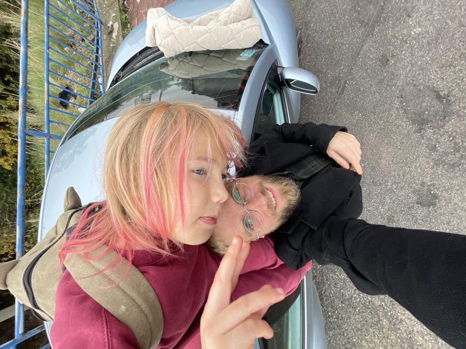 A child with blond and pink hair is posing next to a man with a beard and glasses. They appear to be lying on a car. The child has a backpack and is making a peace sign. A blue fence is visible in the background, along with some greenery. The man is wearing a black jacket. The car's hood is visible, and a quilted blanket is on the windshield. The setting appears to be outdoors, possibly on a roadside.