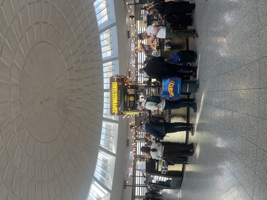 The image displays the interior of a commercial area within Vienna International Airport (VIE) in Schwechat, Austria. The environment is characterized by a large, domed, light grey ceiling with concentric rings of recessed rectangular panels. Multiple large, rectangular skylights are integrated into the dome, providing natural illumination. The floor is tiled with light grey square tiles. At the center of the scene is a circular or semi-circular bar kiosk, identified by a prominent sign as "ZAPFMEISTEREI THE BEER BAR." The sign itself is shaped like a copper-colored beer barrel with yellow lettering. The bar features dark countertops and glass display cases exhibiting food items, including pastries and sandwiches. Decorative string lights are suspended above the bar area. Approximately ten to twelve individuals are observed standing in a queue-like formation around the bar. Most are casually dressed. Several individuals have carry-on suitcases, predominantly black, positioned on the floor beside them. One person is positioned next to a blue shopping bag labeled "SMYTHS toys superstores," which rests beside a black hard-shell suitcase. Observed actions include individuals holding and looking at mobile phones while waiting. No direct interpersonal interactions are explicitly visible; the individuals appear focused on the bar service.