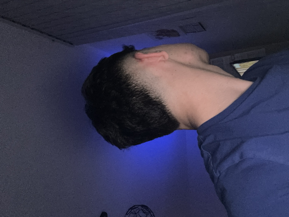 The image depicts a person, observed from a left-rear perspective, within an indoor setting in Kardzhali, Bulgaria. The individual has dark, short hair styled with a distinct skin fade on the sides and back, tapering to a V-shape at the nape of the neck. The person is wearing a dark blue short-sleeved t-shirt. The left ear and a portion of the left side of the face/jawline are visible as the individual looks towards the right side of the frame. The scene is dimly lit, with a prominent blue light source casting a glow on the background wall and ceiling, primarily on the left side of the image. A dark, circular object, possibly a fan or decorative element, is partially visible in the upper-left. On the right, a vertical structural element (likely a door frame or wall corner) is present, with indistinct items mounted on the adjacent wall. A faint glow from a screen or reflective surface is partially visible in the lower-right background. The exact location within Kardzhali is not identifiable from the visual information provided.