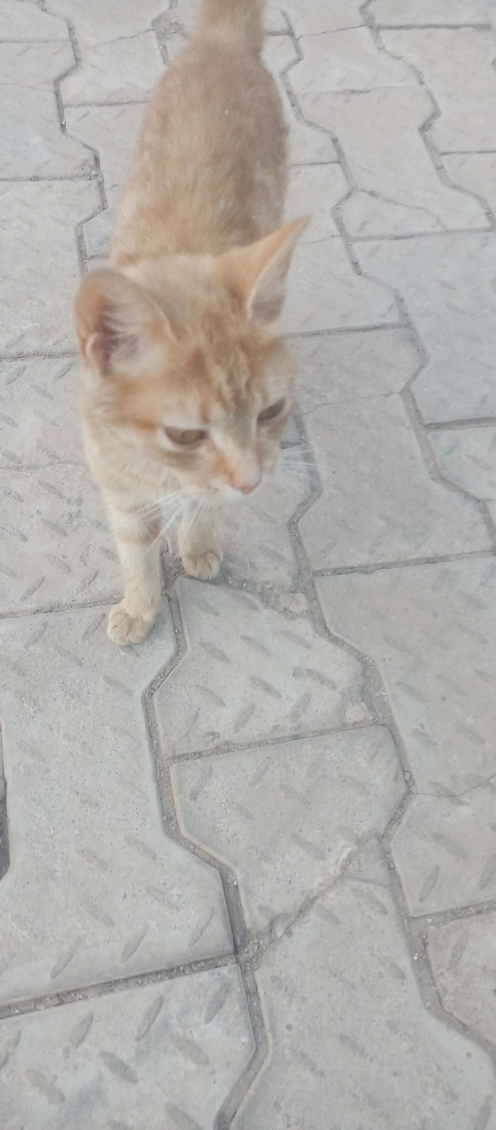 An orange tabby cat stands on interlocking pavement stones, looking down and slightly to the left. Its ears are erect, and its fur appears short. The pavement is a light gray, patterned with diagonal indentations. The cat's tail is visible, standing up. The lighting is diffused, creating soft shadows around the cat and on the pavement.
