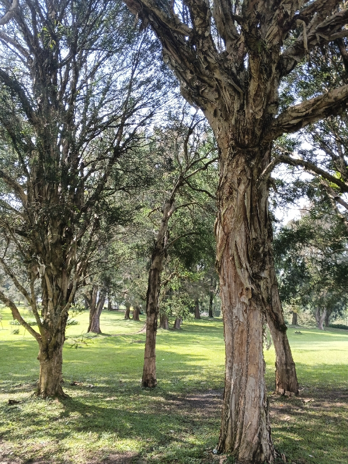Sunlight filters through a grove of trees onto a lush green field. The trees are characterized by their rough, peeling bark, casting long shadows across the grass. In the distance, more trees stand, defining the edge of the field. The scene conveys a sense of serenity and natural beauty, highlighting the textures of the tree bark and the vibrant green of the grass.