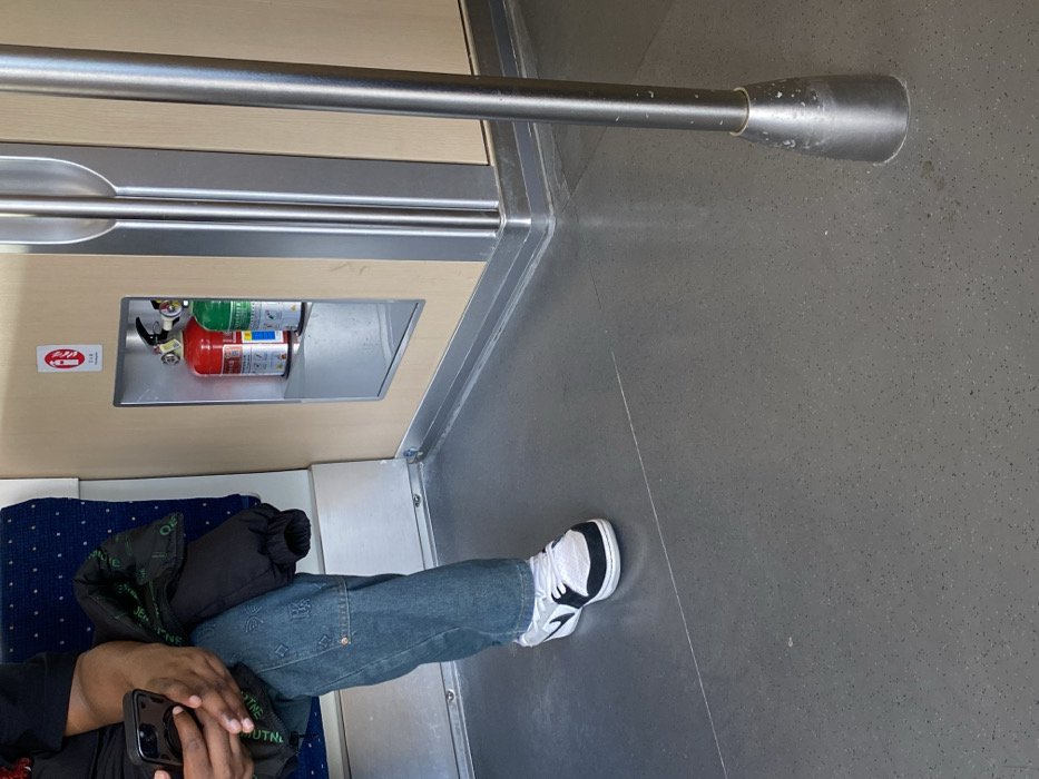 The image depicts the interior of a modern train or subway car, likely within Shunde District, China, based on the presence of Chinese text on safety equipment. A seated individual occupies the left foreground, with only their lower torso, legs, and hands visible. This person, with a brown skin tone, wears a dark t-shirt, blue denim jeans featuring a repeating light-colored logo pattern, and white and black low-top sneakers. A black puffer jacket with a green lining is folded on their lap. Both hands are engaged with a dark-colored smartphone. The environment features a light gray, speckled floor and light wood-paneled walls. On the right wall, a recessed metallic cabinet contains three compact fire extinguishers: two red and one green. Above the cabinet, a white rectangular sign with a red icon of a running figure and Chinese characters denotes a fire safety point. A polished metallic vertical pole with a conical base stands on the far right, extending from the floor. A blue fabric seat with a subtle speckled pattern is partially visible behind the seated individual.