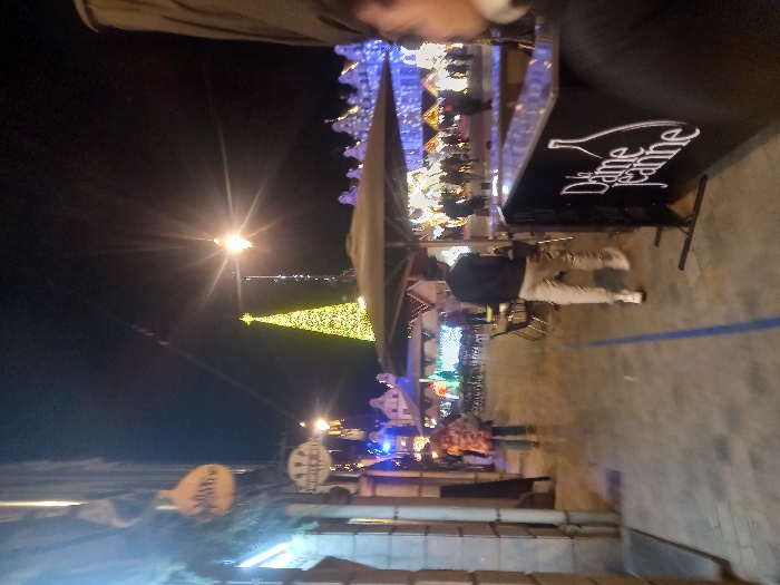 A nighttime scene shows a Christmas market with festive lights and decorations. A large Christmas tree shines in the distance. People walk through the market, and a "Dame Jeanne" sign is visible at a stall. A person is standing by the stall. The lighting suggests an outdoor setting, with various structures illuminated by colorful lights.
