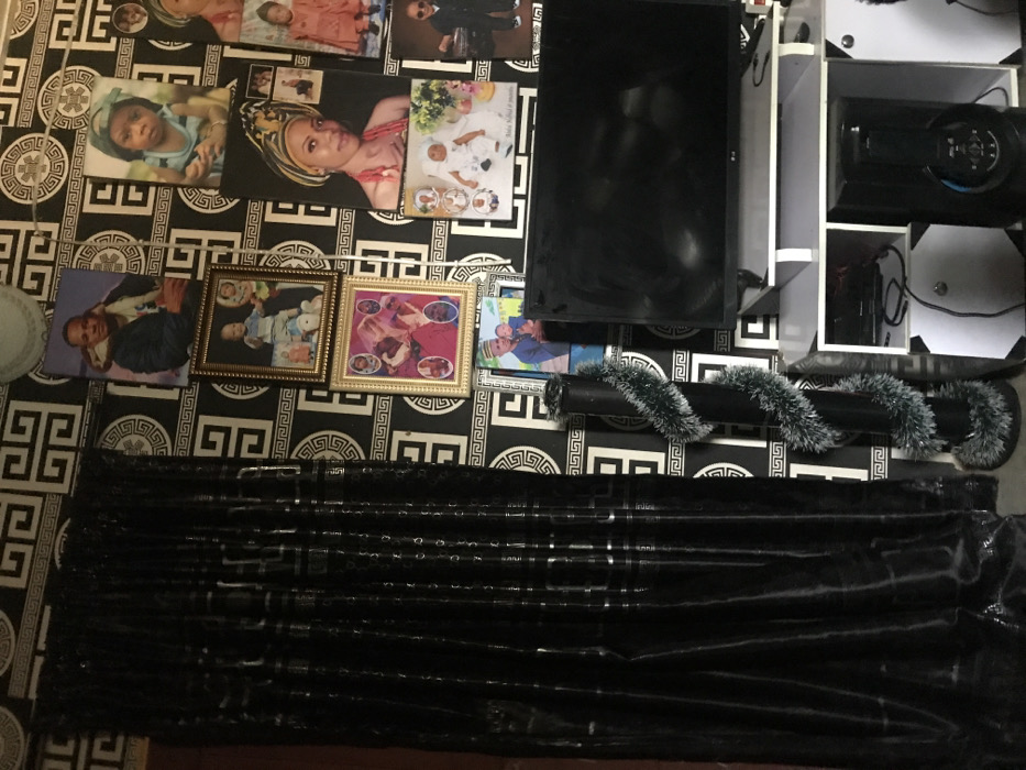 This image depicts an interior residential space in Oba-Ile, Nigeria, characterized by a wall covered in black and white geometric patterned wallpaper. A dark, possibly black, curtain hangs on the left side, extending from ceiling to floor. The wall is extensively decorated with approximately ten to twelve framed and unframed photographs, primarily portraits of individuals and groups of varying ages, from infants to adults. Subjects in the photographs include men, women, and children, some appearing in traditional Nigerian attire. Below the photographs, a black flat-screen LG television is centered on a white and grey media console. The television screen is dark, indicating it is off. On the console, beneath the television, are several electronic devices, including a silver-fronted unit (possibly a DVD player) and a large black speaker unit with a circular blue-lit accent. Various cables are visible connecting these devices. To the left of the media console, a dark, cylindrical object, possibly a decorative pillar or speaker, is wrapped with silvery-green tinsel in a spiraling pattern.