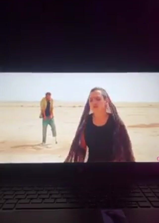 laptop screen displaying a desert scene. At first, a man with a large back tattoo stands with his back to the camera. Then, a woman with long dark hair and a headscarf appears, facing the camera. In the background, a man on crutches is visible. The video concludes with a close-up of an older man with short, light hair. The video is being filmed in a dimly lit room, with the laptop keyboard and the videographer's hand partially visible.