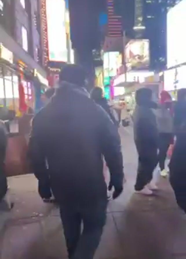 A low-angle POV shot captures a nighttime scene in Times Square, New York City