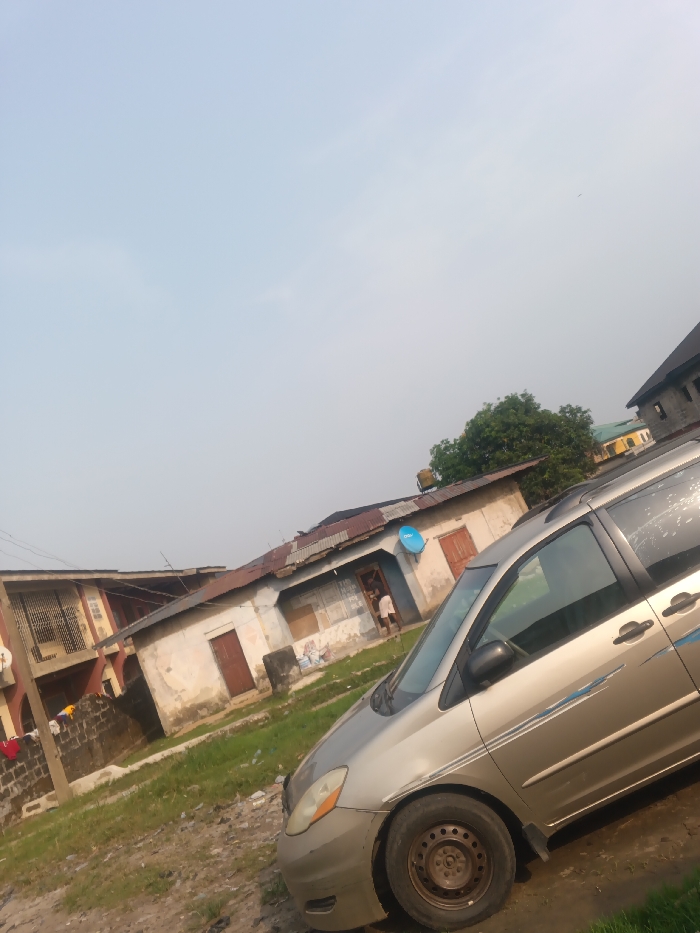 This image captures a daytime scene in Okere-Urhobo, Nigeria, featuring residential buildings and a parked vehicle under a hazy, light blue-grey sky