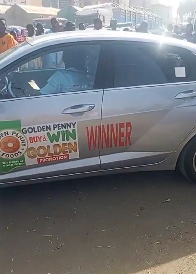 silver sedan parked on a dirt street surrounded by people. The car is marked with "GOLDEN PENNY FOODS" and "BUY & WIN GOLDEN PROMOTION" decals and "WINNER" is written in large red letters. A person is sitting in the driver's seat. People are walking around the car and observing. The background includes buildings, other vehicles, and more people. An alarm or siren is audible.